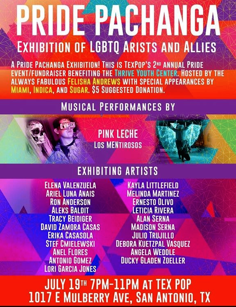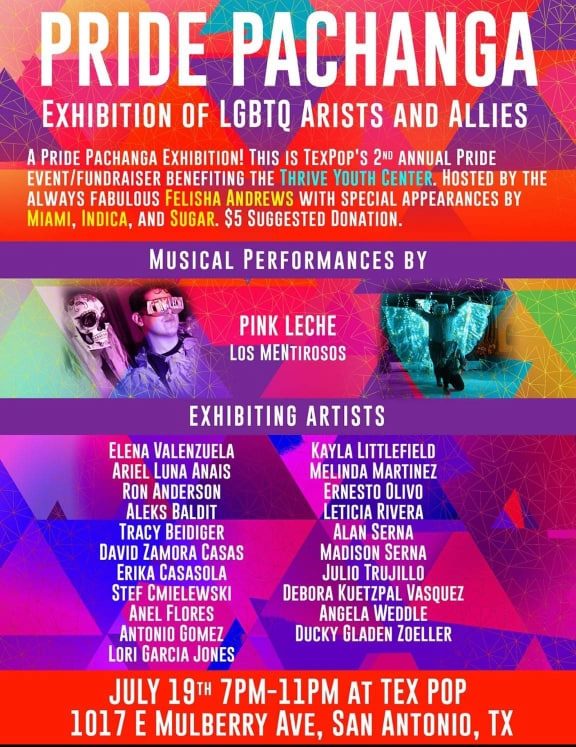 Pride is celebrated all across San Antonio this month and TexPop returns to its annual Pride event/fundraiser benefiting the Thrive Youth Center! We open our event with A Pride Collective art show featuring 22 LGBTQ artists and allies! The opening is on Friday July, 19th from 7pm to 11pm coinciding with our Pride Party Pachanga featuring performances by Drag Queens, Drag Kings, and live music from Pink Leche! The exhibit will run for 4 weeks so come check it out!